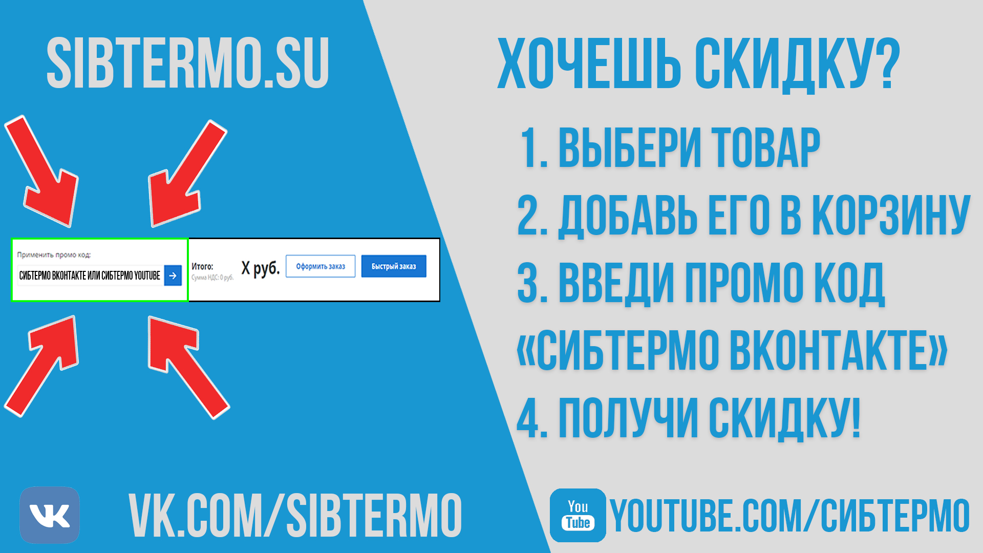 Специально для наших подписчиков YouTube канала и группы ВКонтакте, мы предоставляем скидку 3% на абсолютно всю продукцию компании СИБТЕРМО!
